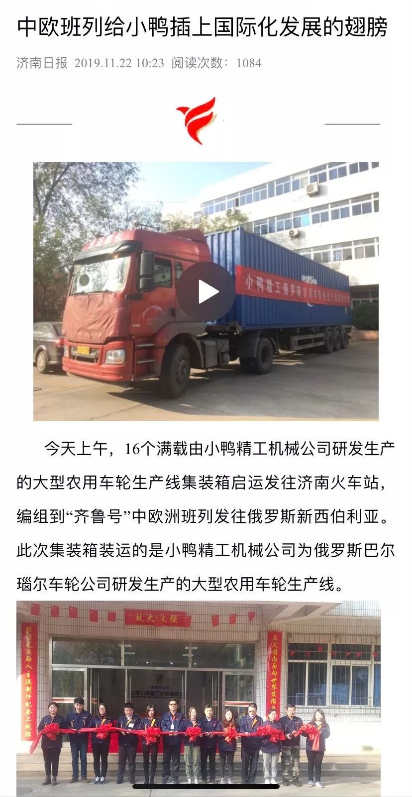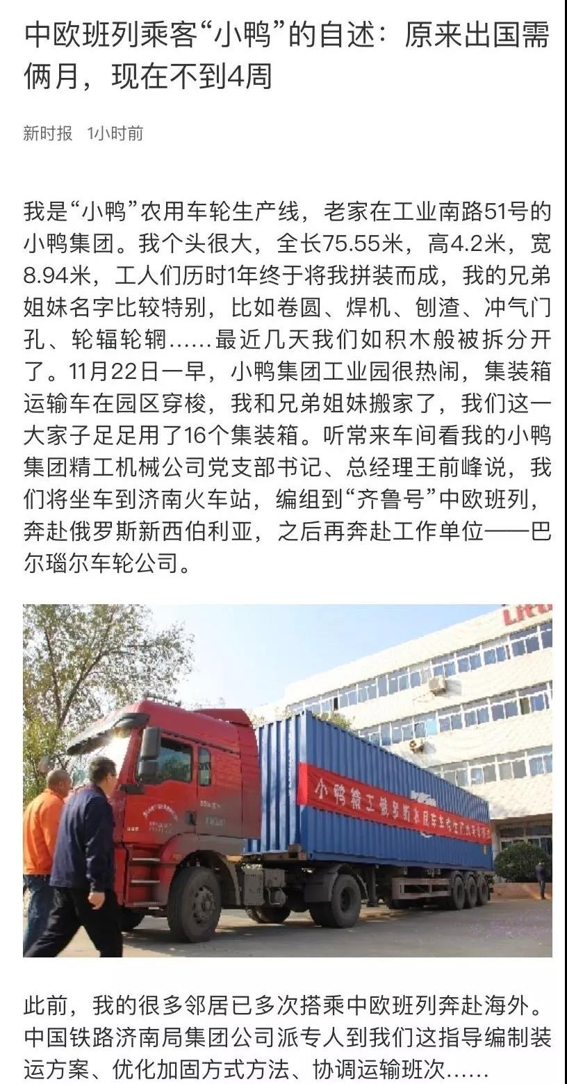 11月22日,小鴨制作白俄羅斯農運車車轱轆出廠線發車慶典正式啟動,16個集裝箱將連續發到濟南火車站,編組到"齊魯號"班列寄往烏克蘭新西伯利亞。