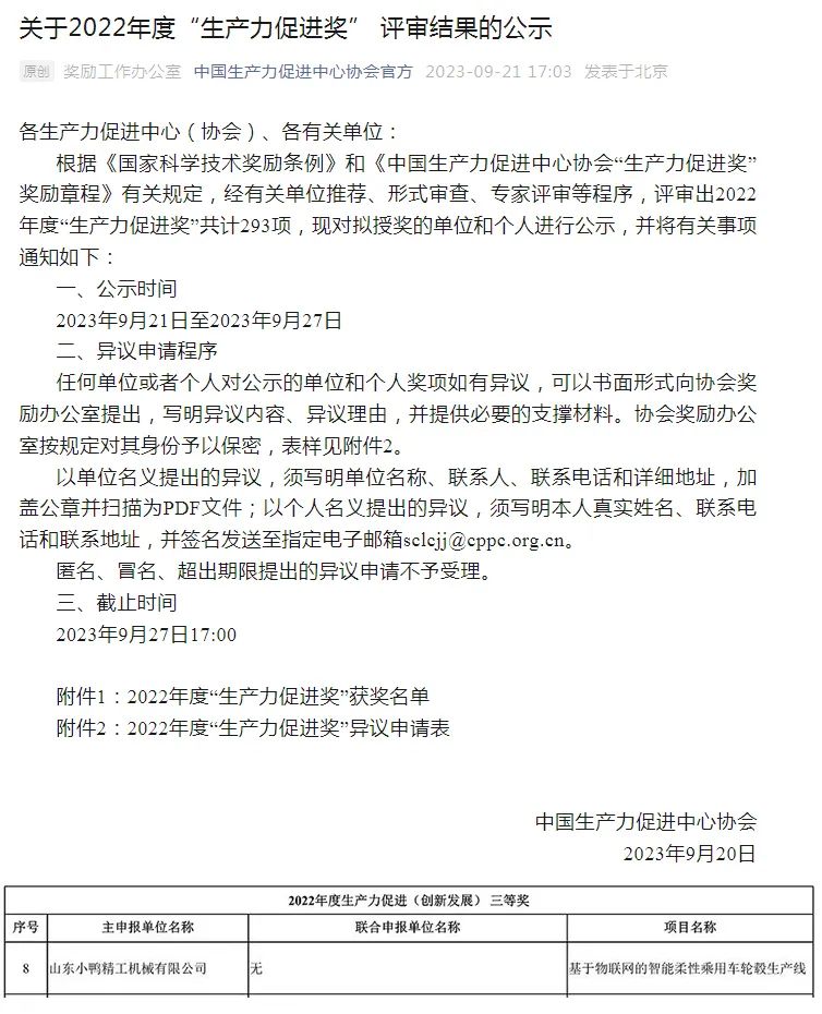 捷報,小鴨精工獲中國出產力增進中間協會出產力增進獎三等獎