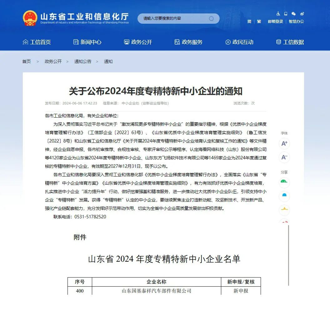 專精特新是特指具有“專業化、邃密化、特點化、新奇化”特點的企業。在山東省2024年度經由過程復核的專精特新中小企業中,小鴨精工車橋出產基地(國基泰祥廠區)名列此中。